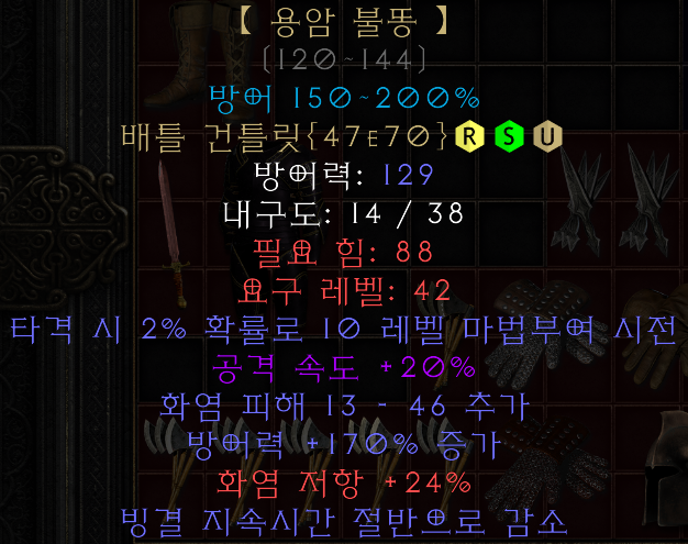 용암 불똥 배틀 건틀릿 ![]() 방어력: 120~144 내구도: 38 필요 힘: 88 요구 레벨: 42 타격 시 2% 확률로 10 레벨 마법부여 시전 공격 속도 +20% 화염 피해 13 - 46 추가 방어력 +150~200% 증가(변동) 화염 저항 +24% 빙결 지속시간 절반으로 감소 |