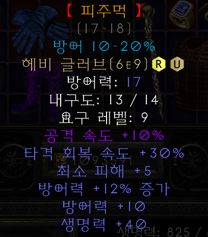 피주먹 헤비 글러브 ![]() 방어력: 17~18 내구도: 14 요구 레벨: 9 공격 속도 +10% 타격 회복 속도 +30% 최소 피해 +5 방어력 +10~20% 증가(변동) 방어력 +10 생명력 +40 |