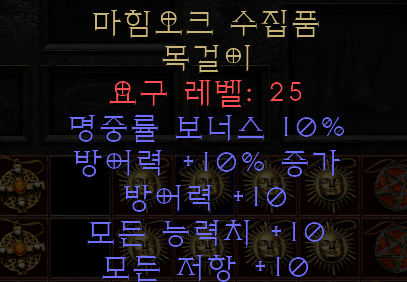 마힘오크 수집품 목걸이 ![]() 요구 레벨: 25 명중률 보너스 10% 방어력 +10% 증가 방어력 +10 모든 능력치 +10 모든 저항 +10 |