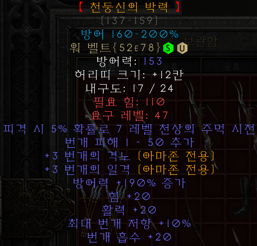 : 서슬꼬리나 스웹벨트에 비해서는 졸업템이라 말하기 어렵지만, 힘/활력 등 옵션을 높게 올려주는 옵션과 번개 흡수 옵션이 있어서 특수한 상황에서 사용하기 좋은 아이템이다.
