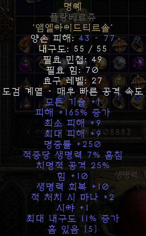다만, 재료인 5소켓 무기를 27레벨에 구하기가 어렵다는 단점이 있다.