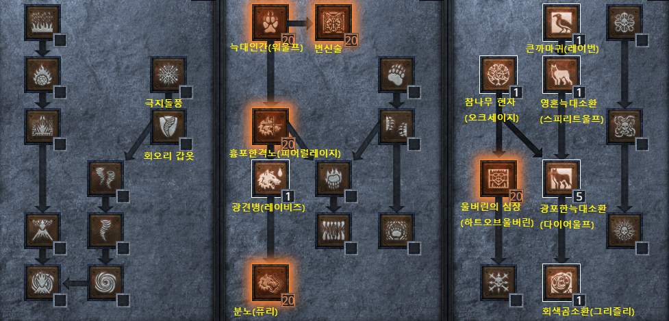 : 개인취향에 따라 울버린의 심장 대신에 참나무 현자를 올려 사용하기도 하고, 흉포한 격노 대신 회색곰소환에 더 많은 포인트를 투자하기도 합니다. 주로 소환하여 사용할 소환수에 따라 투자할 포인트가 달라질 수 있습니다. 간혹 세팅상황과 취향에 따라 회오리 갑옷을 사용하는 분들도 있습니다.