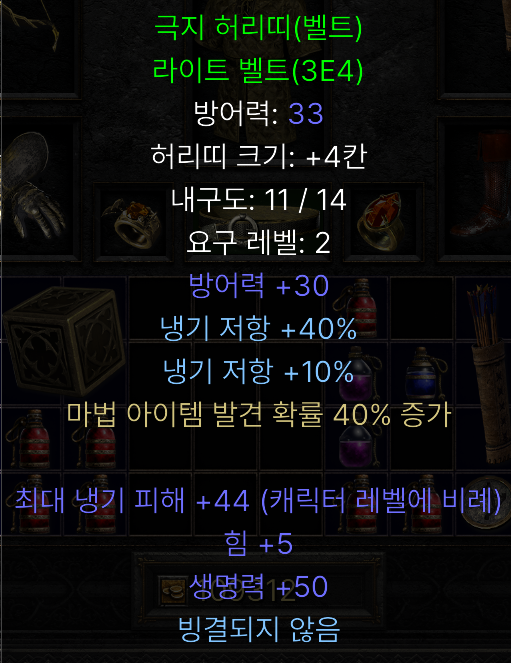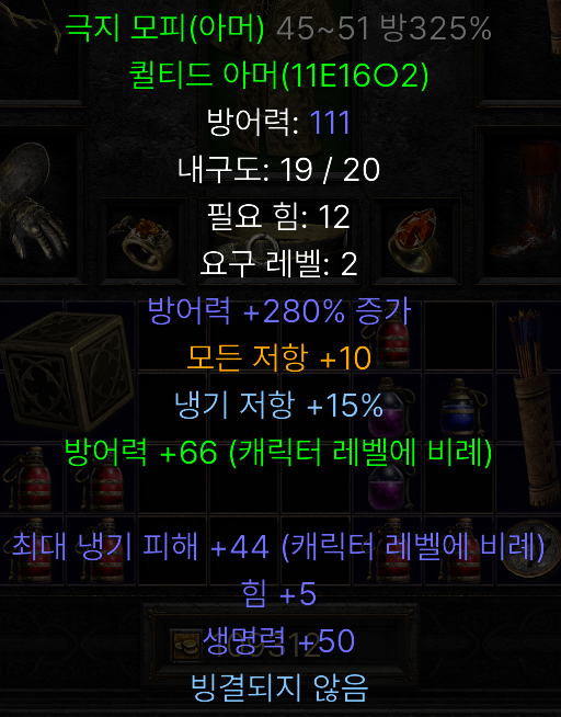 완성 세트 보너스 냉기 피해 6 - 14 추가 냉기피해는 2.4패치에 아래와 같이 변경예정 (최대 냉기 피해 +2-198(캐릭터 레벨당 +2) 힘 +5 생명력 +50 빙결되지 않음 |