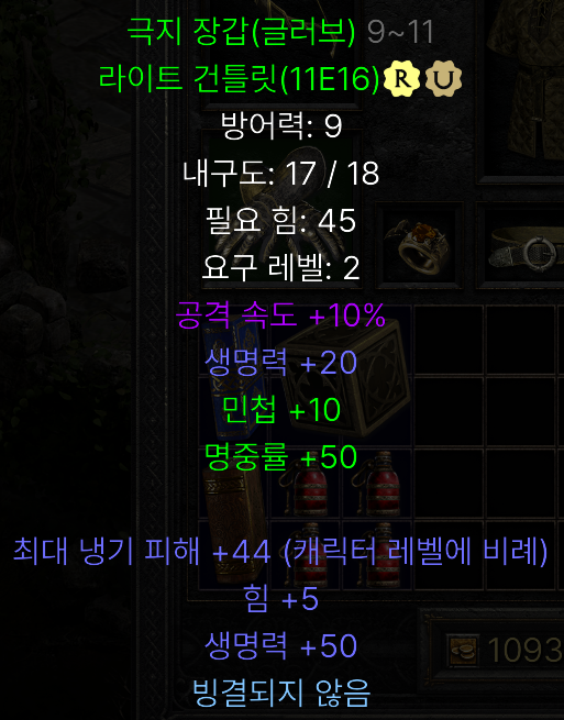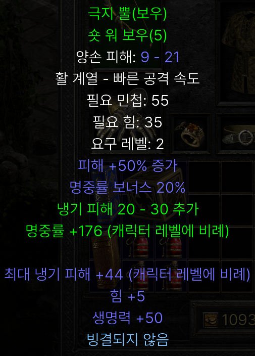 2레벨부터 사용은 가능하지만 필요한 힘과 민첩 때문에, 활(민첩55필요)과 장갑(힘45필요)은 레벨이 좀 더 올라야 착용이 가능합니다.