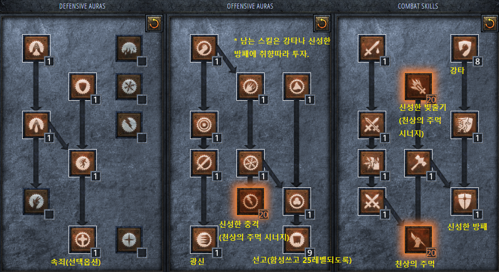 : 선고 오라 대신에 광신오라와 열의와 희생을 연마한 특성입니다. 언데드와 악마몹은 천상의 주먹으로 잡고 열의딜로도 몹을 잡을 수 있는 특성입니다.