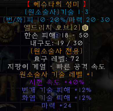 에슈타의 성미 엘드리치 오브 ![]() 한손 피해: 18 - 50 내구도: 30 (원소술사 전용) 요구 레벨: 72 공격 속도: [-10] 원소술사 기술 레벨 +1~3 (변동) 시전 속도 +40% 번개 기술 피해 +10~20% (변동) 화염 기술 피해 +10~20% (변동) 마력 +20~30 (변동) |