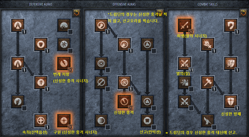 드림딘의 경우 (꿈 룬워드를 투구와 방패에 착용하여, 두 아이템에서 신성한 충격 30레벨이 발동되기 때문에, 신성한 충격 스킬을 찍지않고, 선고 오라를 만땅 찍어주고, 선고오라를 켜고 딜을 합니다.