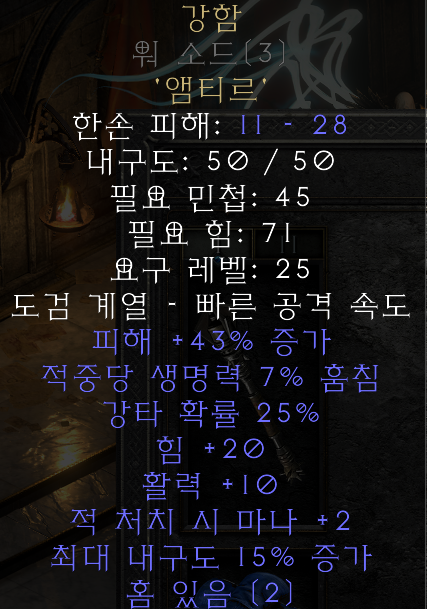 강함 ![]() 피해 +35% 증가 적중당 생명력 7% 훔침 강타 확률 25% 힘 +20 활력 +10 적 처치 시 마나 +2 |