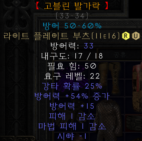 고블린 발가락 라이트 플레이트 부츠 방어력: 33~34 암살자 발차기 피해: 8 - 16 내구도: 18 필요 힘: 50 요구 레벨: 22 강타 확률 25% 방어력 +50~60% 증가 (변동) 방어력 +15 피해 1 감소 마법 피해 1 감소 시야 -1 |