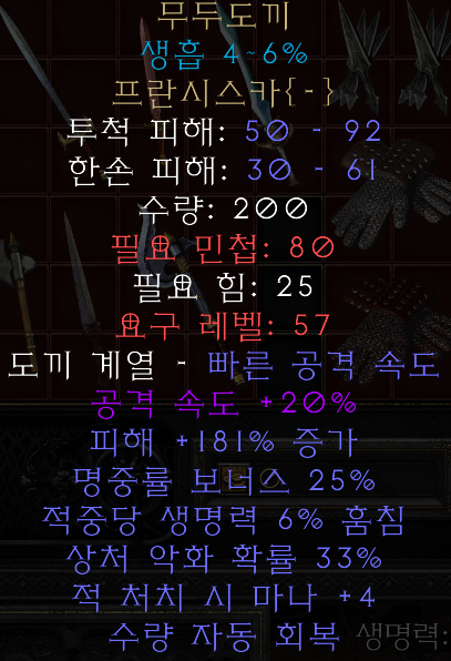 무두도끼 프란시스카 투척 피해: (45~54) - (82~99) 한손 피해: (27~33) - (55~66) 수량: 130 필요 민첩: 80 필요 힘: 25 요구 레벨: 57 공격 속도: [10] 공격 속도 +20% 피해 +150~200% 증가 (변동) 명중률 보너스 25% 적중당 생명력 4~6% 훔침 (변동) 상처 악화 확률 33% 적 처치 시 마나 +4 수량 자동 회복 |