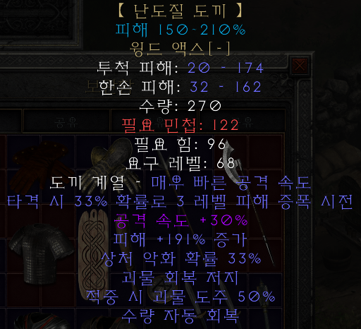난도질 도끼 윙드 액스 ![]() 투척 피해: (17~21) - (150~186) 한손 피해: (27~34) - (140~173) 수량: 180 필요 민첩: 122 필요 힘: 96 요구 레벨: 68 공격 속도: [-10] 타격 시 33% 확률로 3 레벨 피해 증폭 시전 공격 속도 +30% 피해 +150~210% 증가 (변동) 상처 악화 확률 33% 괴물 회복 저지 적중 시 괴물 도주 50% 수량 자동 회복 |
