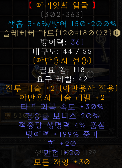 아리앗의 얼굴 슬레이어 가드 ![]() 방어력: 302~363 내구도: 55 (야만용사 전용) 필요 힘: 118 요구 레벨: 42 +2 전투 기술(야만용사 전용) 야만용사 기술 레벨 +2 타격 회복 속도 +30% 명중률 보너스 20% 적중당 생명력 3~6% 훔침(변동) 방어력 +150~200% 증가(변동) 힘 +20 민첩 +20 모든 저항 +30 |