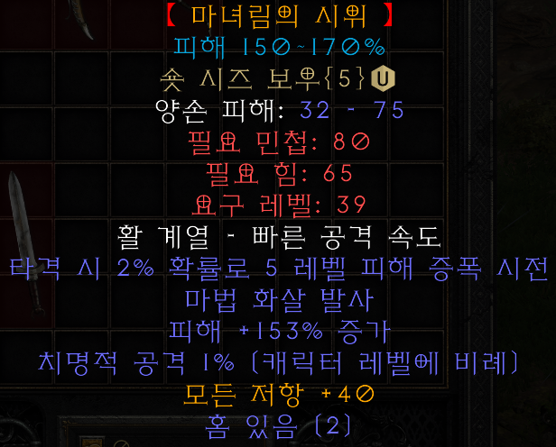 마녀림의 시위 숏 시즈 보우 양손 피해: (32~35) - (75~81) 필요 민첩: 80 필요 힘: 65 요구 레벨: 39 공격 속도: [0] 타격 시 2% 확률로 5 레벨 피해 증폭 시전 마법 화살 발사 피해 +150~170% 증가 (변동) 치명적 공격 1~99% (캐릭터 레벨에 비례) 모든 저항 +40 홈 있음 (2) |