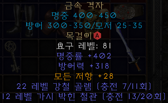금속 격자 목걸이 요구 레벨: 81 명중률 +400~450 (변동) 방어력 +300~350 (변동) 모든 저항 +25~35 (변동) 22 레벨 강철 골렘 (충전 11회) 12 레벨 가시 박힌 철관 (충전 20회) |