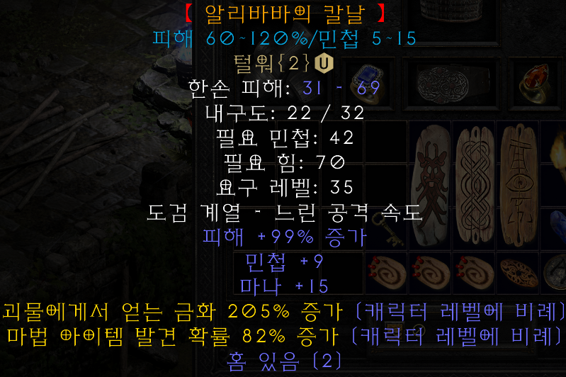: 골드획득과 마법 아이템 발견 확률 때문에 사용하는 아이템입니다.