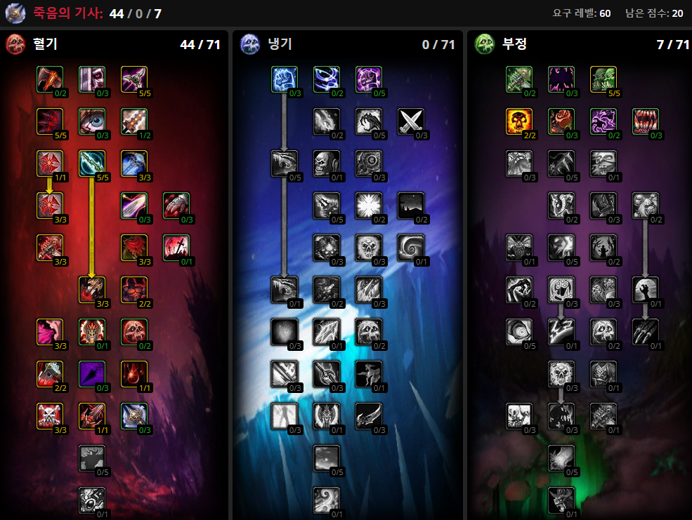 (동영상에서 사용한 특성 /문양 링크 : https://www.wowhead.com/wotlk/ko/talent-calc/death-knight/0325021530033303201223101351--0052_001xv511xv631sxd41ts8 )