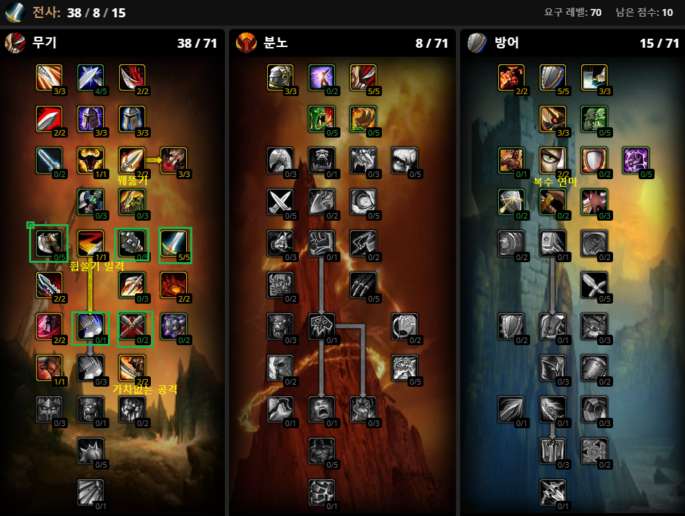 분노쪽 특성을 딜을 높이기 위한 특성들인데, 상황에 따라 다른곳에 투자해도 됩니다.
