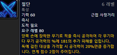 : 암살 도적의 콤보 쌓는 스킬은 절단 입니다. 유지해야하는 버프는 난도질과 피의 갈망, 독살 버프입니다. 독살로 콤보를 마무리합니다. 신속한 결말 특성으로 난도질 시간은 갱신됩니다. 냉혈과 독살을 묶어 쿨마다 사용합니다.