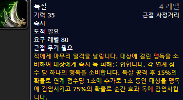 : 암살 도적의 콤보 쌓는 스킬은 절단 입니다. 유지해야하는 버프는 난도질과 피의 갈망, 독살 버프입니다. 독살로 콤보를 마무리합니다. 신속한 결말 특성으로 난도질 시간은 갱신됩니다. 냉혈과 독살을 묶어 쿨마다 사용합니다.