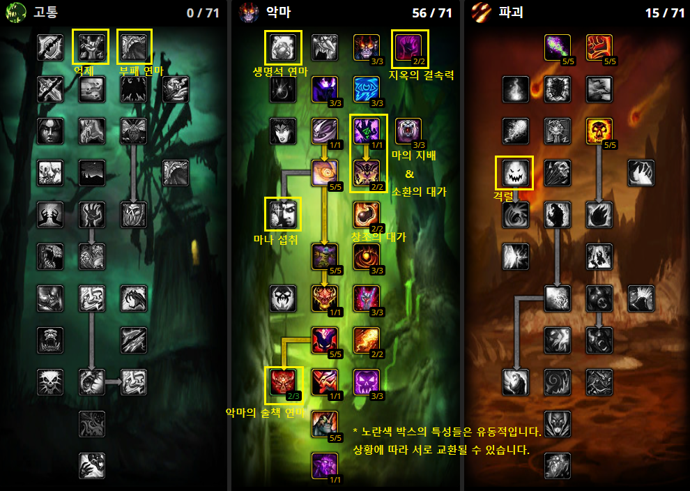 - 지옥의 결속력 : 소환수에게 비교적 많은 양의 힐을 할 수 있습니다. 지옥수호병을 사용할 경우 필수적이지 않기 때문에, 다른곳에 투자할 수 있습니다.
