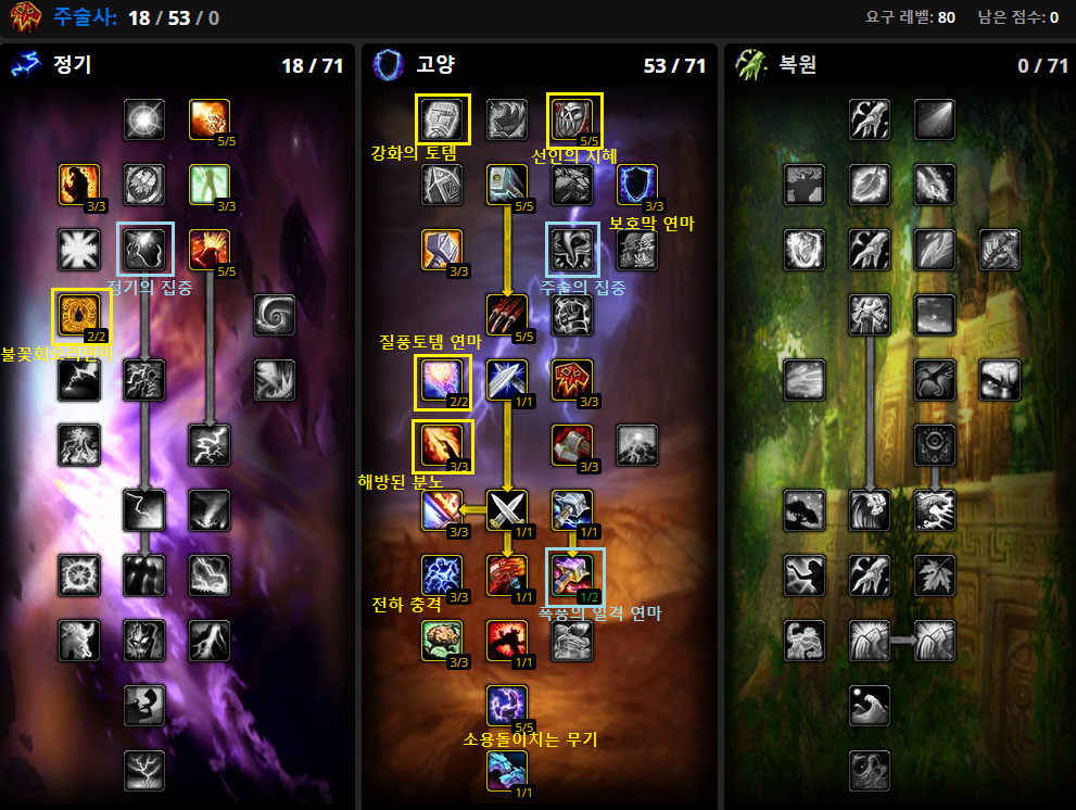 : 선인의 지혜 - 지능 10% 증가 특성입니다. 교묘한 정신 특성으로 지능의 100%만큼 전투력이 증가하므로, 지능을 올려주는 특성은 DPS 면에서 도움이 됩니다. 하지만 필요에 따라 강화의 토템에 3포인트를 투자하기도 합니다.