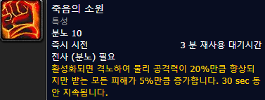 : 죽음의 소원 (격노하여 물리 공격력이 20%만큼 향상되지만 받는 모든 피해가 5%만큼 증가합니다. 30초 동안 지속 - 3분 쿨)