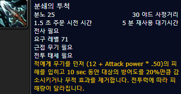 - 분쇄의 투척 : 무기를 던져 (12 + Attack power * .50)의 피해를 입히고 10초 동안 대상의 방어도를 20%만큼 감소시키거나 무적 효과를 제거. 5분쿨.