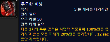 : 무모한 희생 (다음 3회의 특수 공격은 치명타 적중률이 100%만큼 증가하고 받는 모든 피해가 20%만큼 증가합니다. 12초동안 지속 - 5분 쿨)