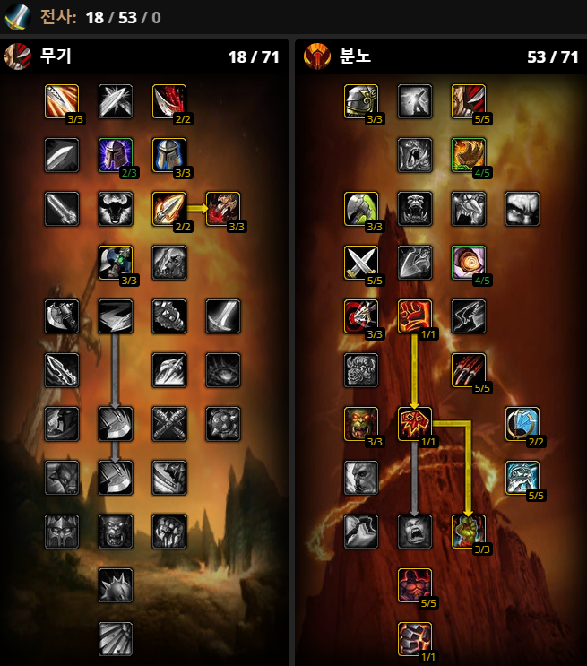 : 오크(호드) - 강인함(기절시간 15% 감소) / 도끼류 전문화(장착 무기, 한손 및 양손 도끼류 숙련 5증가) / 지배(소환수 공격력5%증가) 피의 격노 (15초동안 근접 전투력이 6증가 - 1레벨기준)