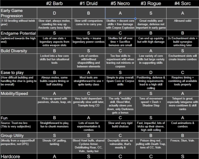 - 드루이드 : 빌드의 다양성이 무궁무진, 플레이도 재미있는편, 생존력도 뛰어남, 파티원과의 시너지도 좋음.
