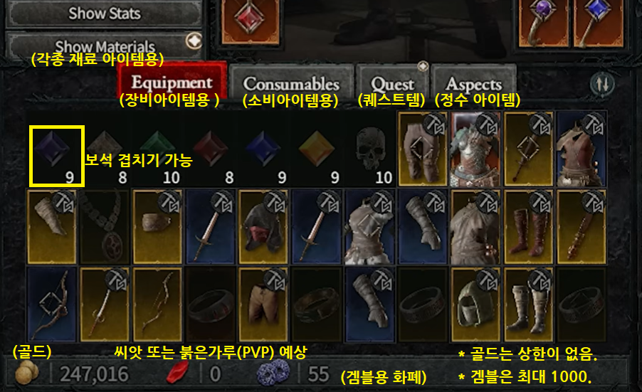 : 장비탭, 소비용품탭, 퀘스트탭, 정수탭 등이 따로 나뉘어져 있습니다.