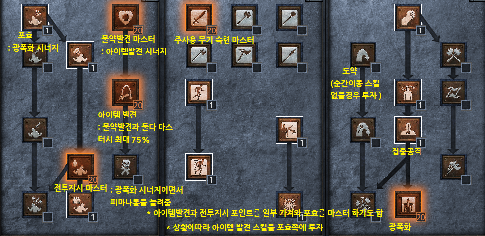 : 포효를 사용해서, 잔몹을 처리하고, 유니크몹을 광폭화로 잡으면 됩니다. 시체를 뒤집을때 아이템 발견 확률을 최대한 높이는 것이 파밍에 좋지만, 아이템 발견쪽 스킬을 일부 포효쪽에 투자할 수도 있습니다. 또는 전투지시와 아이템 발견쪽 스킬을 포효쪽으로 옮겨 포효를 마스터 하기도 합니다. 포효 스킬 레벨이 높으면 반경이 늘어나고, 시간도 길어져서 더 편하게 유티크몹만 처리 할 수가 있습니다.