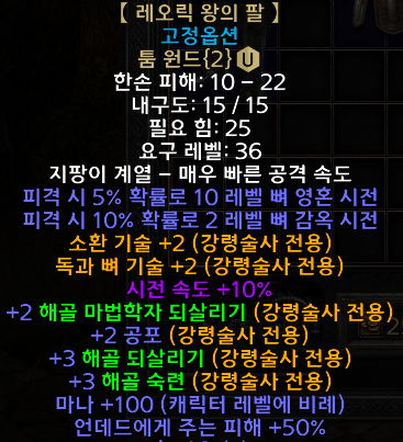 레오릭 왕의 팔 툼 원드 한손 피해: 10 - 22 내구도: 15 필요 힘: 25 요구 레벨: 36 공격 속도: [-20] 피격 시 5% 확률로 10 레벨 뼈 영혼 시전 피격 시 10% 확률로 2 레벨 뼈 감옥 시전 +2 소환 기술(강령술사 전용) +2 독과 뼈 기술(강령술사 전용) 시전 속도 +10% +2 해골 마법학자 되살리기(강령술사 전용) +2 공포(강령술사 전용) +3 해골 되살리기(강령술사 전용) +3 해골 숙련(강령술사 전용) 마나 +1~123(캐릭터 레벨에 비례) 언데드에게 주는 피해 +50% |