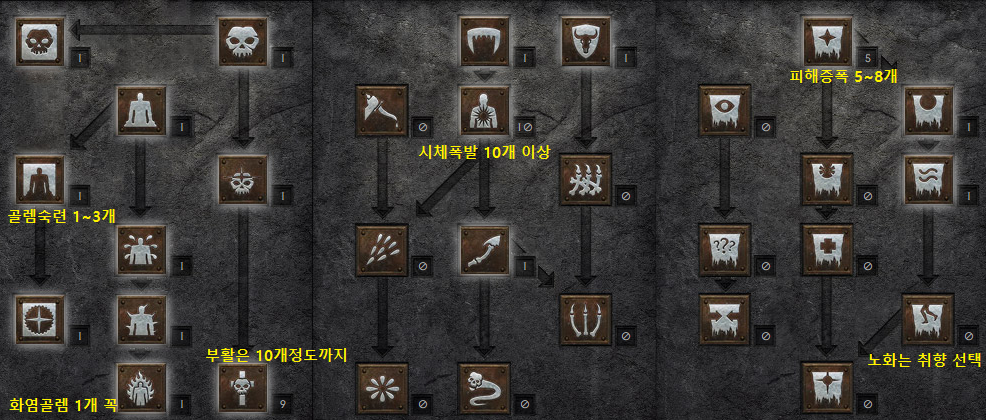 : 기본 위와 같이 찍은 후에, 레벨업시 해골 되살리기 마스터후 해골 숙련 마스터, 시체 폭발 마스터.