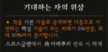 ![]() 기대하는 자의 위상 - 적을 기본 기술로 공격하면 다음으로 시전하는 핵심 기술이 주는 피해가 5%만큼, 최대 30%까지 증가합니다. (목걸이,무기,장갑, 반지에 가능) - 아래뿌리. |
