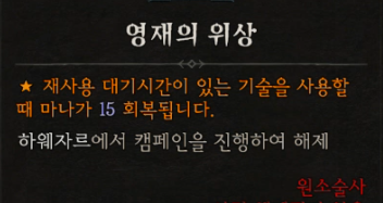 ![]() 영재의 위상 - 재사용 대기시간이 있는 기술을 사용할때 마나가 15~25 회복됩니다. (반지에 가능) - 마녀나루 . |