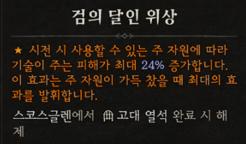 ![]() 검의 달인 위상 - 시전 시 사용할 수 있는 주 자원에 따라 기술이 주는 피해가 최대 10% 증가합니다. 이 효과는 주 자원이 가득 찼을 때 최대의 효과를 발휘합니다. (목걸이,무기,장갑, 반지에 가능) - 고대 열석 . |