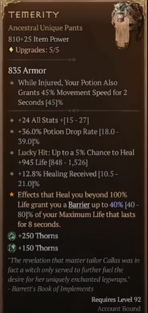 - 분노 폭발 : {20/40/60/80/100/120/140/160/180/200}의 가시를 얻고, 보유한 추가 최대 생명력 (25 -> 50)당 가시를 (20 -> 10) 얻습니다.