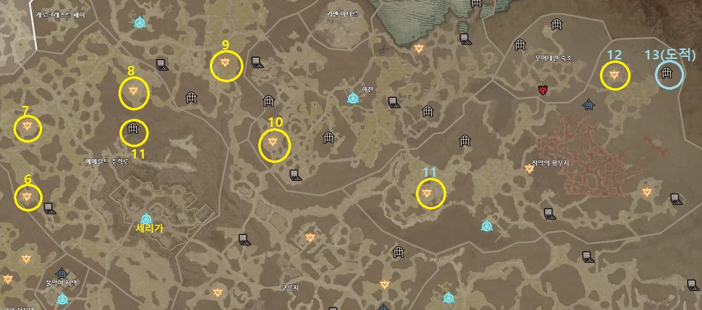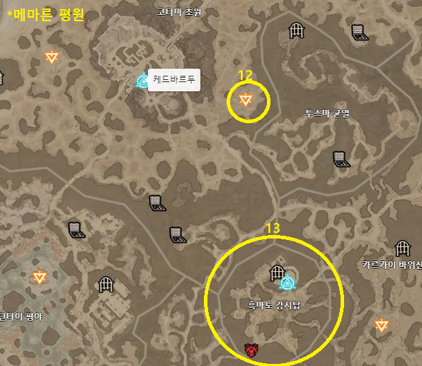 : 메마른 평원 케드바르두 웨이로 이동해, 12번 이벤트를 클리어 후, 13번 위치 흑마노 감시탑 보루를 반복하는 코스 입니다. 흑마노 감시탑 보루의 경우, 파티로 할경우 왼쪽 오른쪽 담당 구역을 정해놓고, 하는것이 효율이 좋다고 합니다. 직업에 따라 속도 차이가 있을 수 있습니다. 12시 방향에 나오는 마지막 보스를 잡지 않고, 리셋하여 반복합니다. 15레벨에 흑마노 감시탑에 오면 몹들은 20레벨이기 때문에, 경험치를 많이 얻을 수 있습니다.