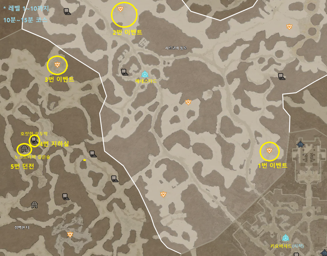 : 키요바샤드에서 시작하여, 앞마당에 이벤트를 하나 완료하고, 메네스타드 웨이로 이동해서 이벤트 2개 클리어 후, 4번 지하실과 5번 던전으로 마무리 하는 코스입니다.