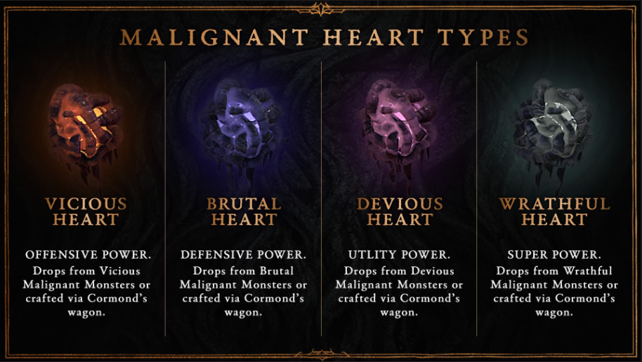- 악의 심장 획득 장소 : 악의 심장을 획득하기 가장 좋은 장소 중 하나는 새롭게 추가되는 악의 굴로, 섬멸해야 할 무시무시한 적들이 가득하여 반복 플레이 가치가 높은 던전입니다. 악의 굴을 구성하는 도합 6개의 던전은 성역 전체에 걸쳐 퍼져 있습니다. 무수히 많은 악의 종자들을 처치한 후에는 2개의 종양과 마주하게 됩니다. 둘 중 하나는 항상 진노의 종양일 것이며, 다른 하나는 던전의 유형에 따라 달라지는 심장이 될 것입니다.
