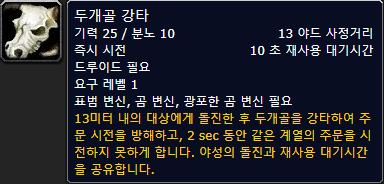 - 4레벨 이상 필요. - 타우렌 : 멀고어( 61, 76)상자에서 우상획득후 착용하고, 몹 6마리를 달빛섬광효과가 있을때 처치 후 아이템을 사용하면 습득. - 나이트엘프 : 시작지점 드루이드 상급자에게서 퀘스트를 받고, 그렐을 사냥하면 우상획득 가능. 우상을 착용하고, 몹 6마리 처치 (달빛섬광효과가 있는동안), 다시 아이템 사용하면 습득. |