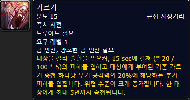 - 나이트엘프 : 어둠의 해안의 우두머리 엉겅퀴곰에게서, 우상 획득후, 착용하고, 우상 설명대로, 인간형에게 출혈피해 20번 완료 후 사용하면 기술 습득. - 타우렌 : 불모의 땅 크로스로드 10시방향 퀘스트지역 오두막에 있는 상자에서 우상획득 후 설명대로 출혈피해 20번 완료 후 기술 습득. |