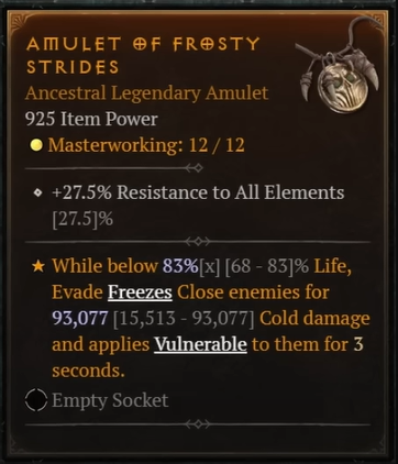 [ 서리 발걸음의 위상 ] 생명력이 45-60%[x] 미만일 때, 피하기가 가까운 적을 빙결 상태로 만들고 XX의 냉기 피해를 주며 3초 동안 취약 상태로 만듭니다. 5월2일자 발표된 1.4.0 패치노트에서 너프가 예상되었지만, 너프되지 않고, 그대로 유지가 되었습니다. 목걸이 또는 양손무기에 바르면 수치를 더 높일 수 있습니다. |