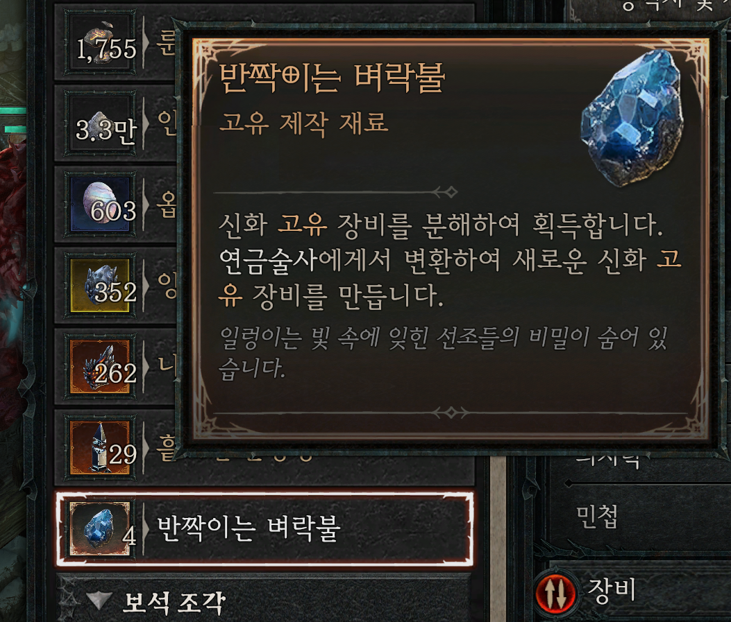 - 참고로, 벼락불은 드랍된게 보이지 않고, 나중에 재료탭에서 확인해보면 수량이 올라가 있습니다.