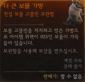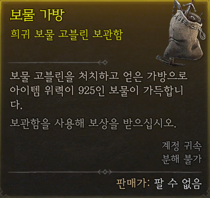 - 보물 고블린이 아이템이 들어있는 가방을 드랍함. 가방에 아이템 등급이 표시되어 있음.