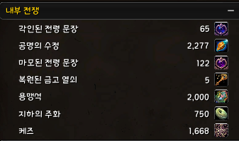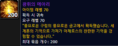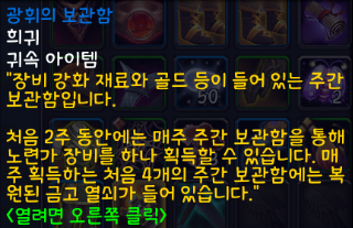 - 정점 보관함 : 도르노갈에서 기록보관소 주간 퀘스트 및 세계혼 주간퀘스트 보상.