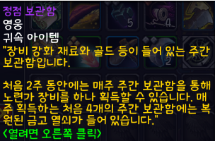 - 아즈카헤트 마을에서 세력 선택을 한 후에 주는 파란느낌표 주간 퀘스트 보상 보관함.