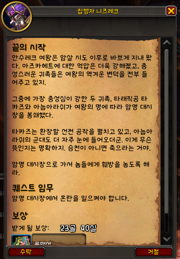 1. 시작퀘스트는 아즈카헤트 지역의 실타래의 도시에 집행자 니즈레크가 주는 " 끝의 시작 " 퀘스트 입니다.
