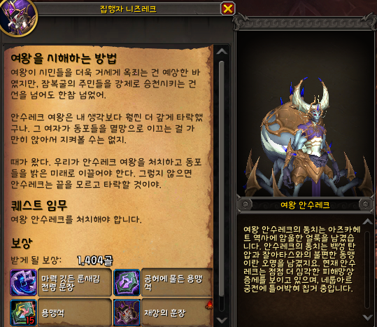 여왕 안수레크를 처치하라는 퀘스트인데, 공격대 던전에서 수행해도 되지만, AI 모드로 안수르크만 잡는 이야기모드로 진행해도 쉽게 완료할 수 있습니다.